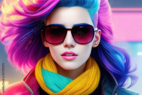 Glamorous hipster teenager in sunglasses. Portrait of millennial pretty girl with clothing and hairstyle in neon colors. Сoncept of nightclub. Generative AI