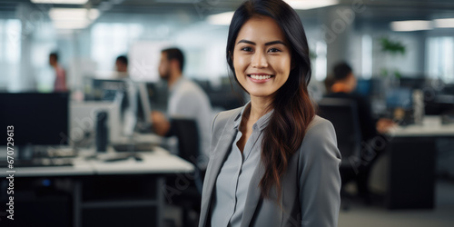 Glamorous oriental female boss with shoulder length hair and glasses, smiling in office environment