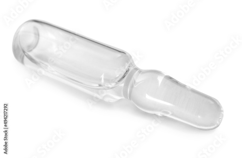 Glass ampoule with pharmaceutical product on white background