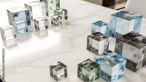 Glass and Blue Toned Cubes on White Marble Surface Abstract Transparency