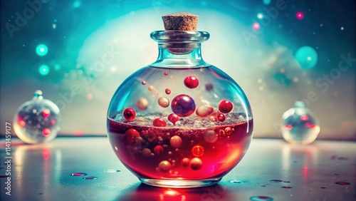 Glass Bottle Filled with Multicolored Spheres and Red Liquid