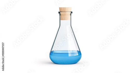 Glass bottle with blue liquid and cork stopper on white background