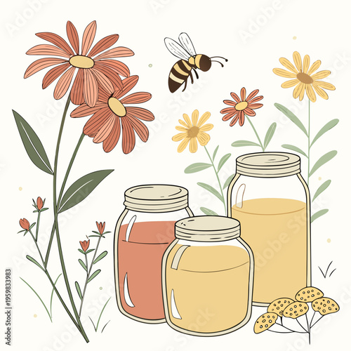 Glass cans with Different types of honey, Zinnia and Heliopsis flowers and bees around in watercolor technique .vector icon