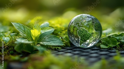 Glass Earth on mossy keyboard, nature theme, environmental concept
