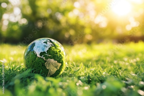 glass globe with green moss growing on it, placed in the center of an outdoor grassy field.
