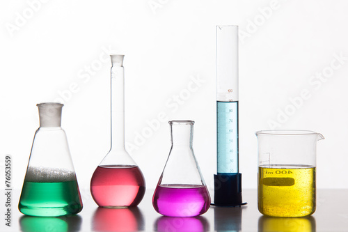 Glass in a chemical laboratory filled with colored liquid during