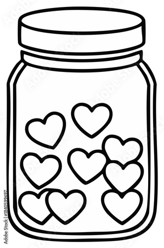 Glass jar filled with numerous heart shapes black outline illustration for creative design projects