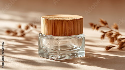 Glass jar with bamboo lid on beige surface