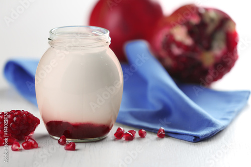 Glass jar with tasty yogurt and jam on wooden background
