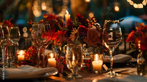 Glass jars flames and bouquets adorn an informal table