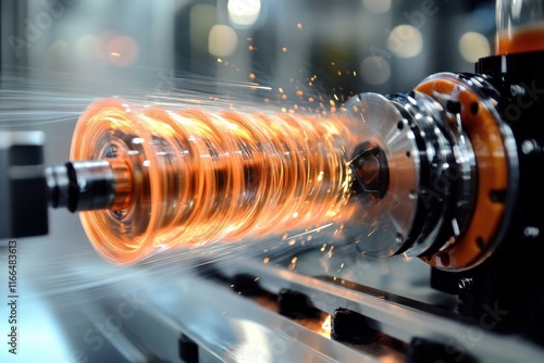 Glass manufacturing process showing glowing molten glass being shaped. Illustrates industrial production, technology, and glassmaking.