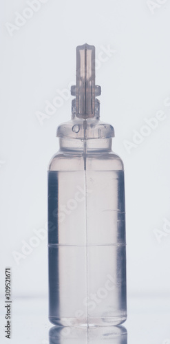 Glass medical ampoule vial for injection. Medicine is dry white drug penicillin powder or liquid with of aqueous solution in ampulla. Close up. Bottles ampule with aluminum cap on backgrounds gray.