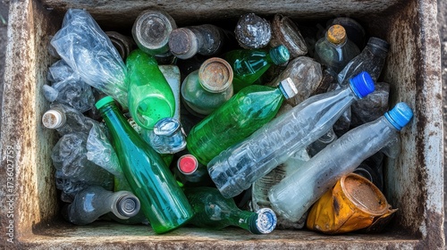 Glass, metal, and plastic arranged in a weathered concrete recycling bin