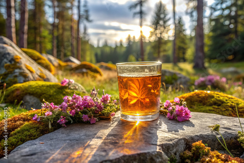 glass of amber iced tea rests on stone surrounded by flowers and nature