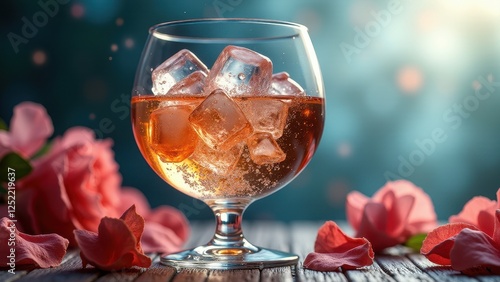 Glass of champagne with melting ice cubes and pink flowers at sunset by the sea