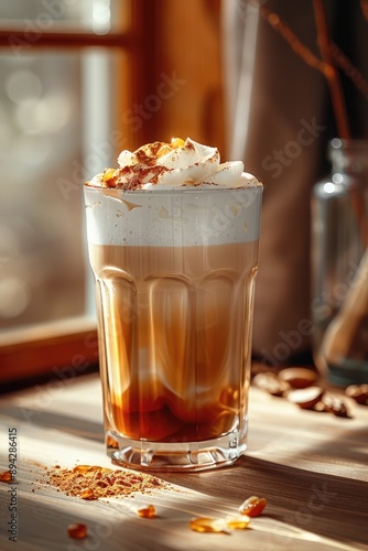 Glass of gourmet latte topped with whipped cream in cozy setting