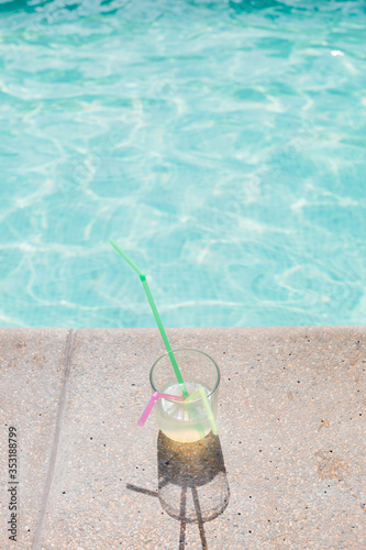 Glass of lemonade with three straws by the swimming pool