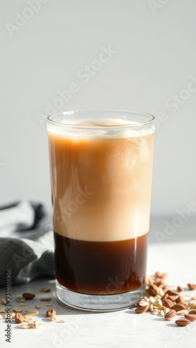 Glass of Oat Milk Latte with Almonds on White Marble Surface