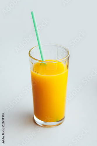Glass of orange juice on a white background.