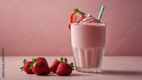Glass of pink strawberry milk with fresh strawberry slices on top, placed on a pastel-colored background.