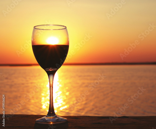 Glass of red wine on sunset background
