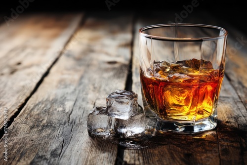 Glass of Scotch Whiskey and Ice on Wooden Table