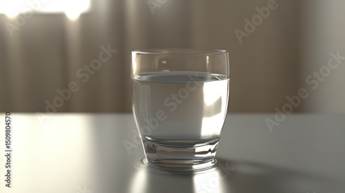 Glass of water on a table, sunlit background.