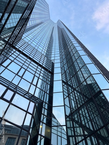Glass skyscraper with reflections and modern architecture, symbolizing innovation and growth.