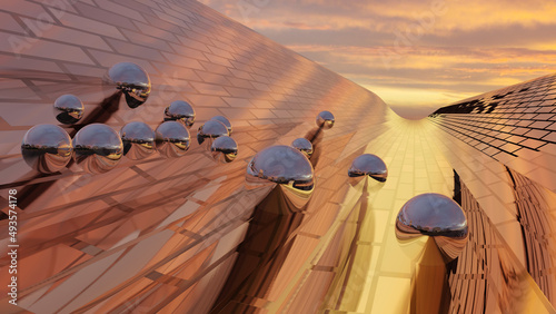 Glitter gold globes are gliding along a gold tile curve wall of drainage in sunset time (3D Rendering)
