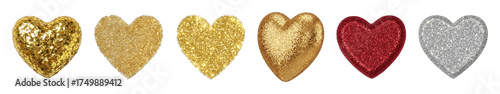Glitter heart set including gold, red, and silver variations isolated. Romantic and festive design elements.