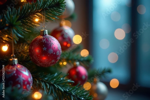 Glittering Christmas tree, colorful ornaments, soft bokeh lights , bokeh, christmas, fir