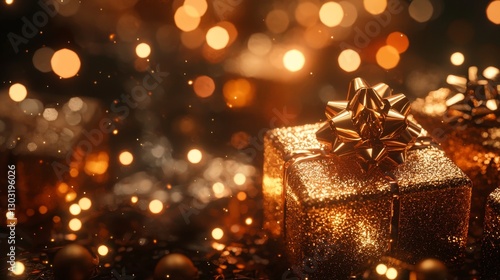 glittering packaging. Rich textures and warm lighting create an inviting atmosphere.