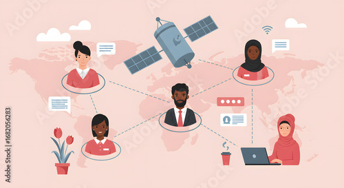Global Connection and Communication Illustration Showing International Collaboration Through Satellite Technology and Diverse Remote Team Members Around the Globe
