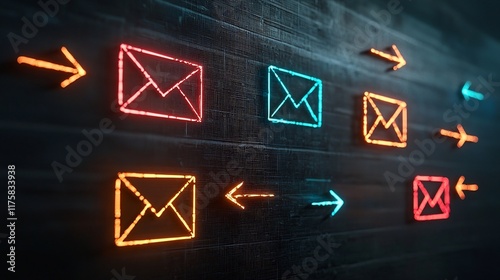 Global digital communication and social network with freehand user interface symbols arrows and mail icons on a dark background Minimalist digital with vibrant colors high detail and a modern
