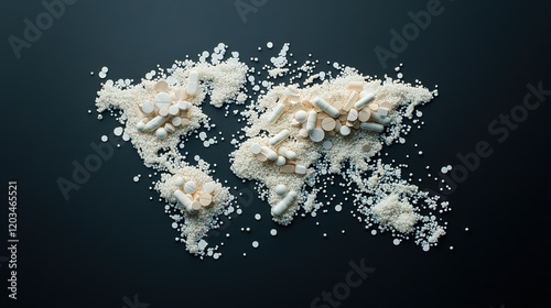 Global Healthcare Landscape, Medicine capsules create a world map on a glossy surface, symbolizing worldwide medicine accessibility and availability