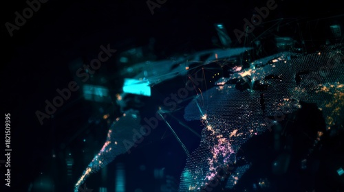 Global network glowing in the dark, showcasing interconnected technology landscapes and data flow, visualizing modern digital communication systems.