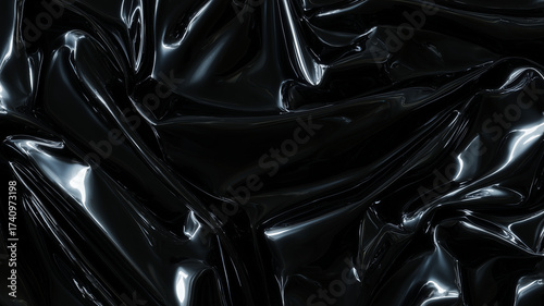 Glossy fluid plastic texture deep black with shiny highlights and dramatic folds creating moody abstract surface