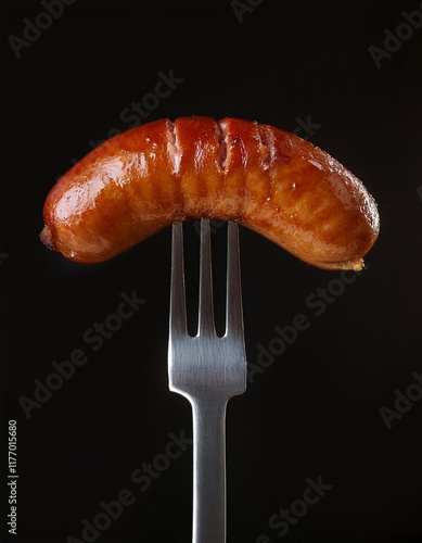 glossy fried sausage with golden caramelized surface on a sleek fork showcasing juicy texture and rich savory flavor against a dark background