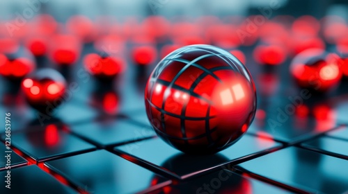 Glossy Red Sphere on a Reflective Surface with Network Pattern