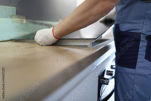 Gloved craftsman installs hob in kitchen. Household Appliance Installation Services Concept