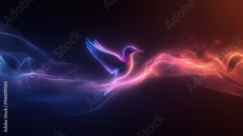 Glowing bird in flight amidst vibrant, swirling nebulae.