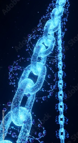 Glowing blue chain links with particles on dark background