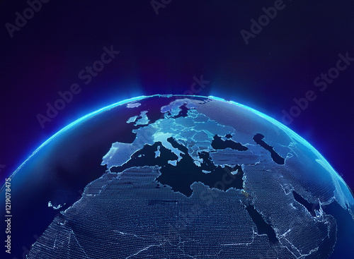 Glowing blue digital globe, centered on Europe, with a dark purple background. The continents are depicted as a network of illuminated points.