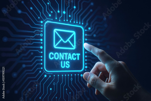 Glowing blue digital interface with envelope icon and contact us text being touched by a human finger