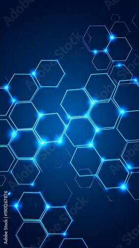 Glowing blue hexagons networked against a dark blue background, futuristic, and modern