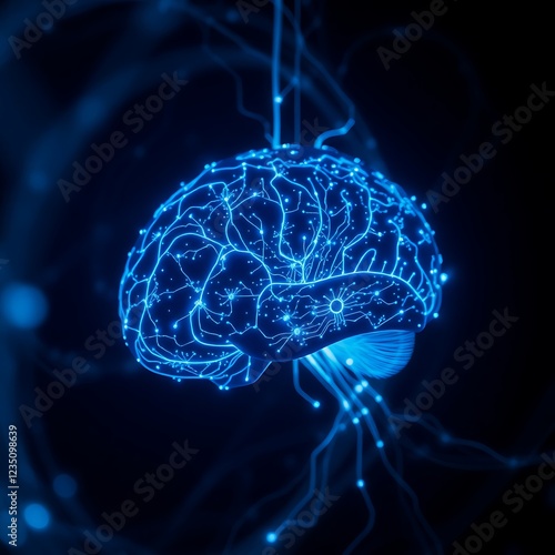 Glowing Blue Holographic Brain Detailed Neural Network Futuristic Medical Visualization Digital Brain Scan Cyberpunk Aesthetic High-Tech Neuroimaging Technology