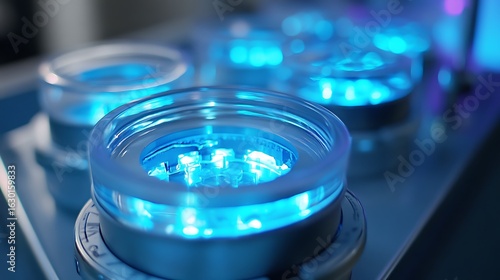 Glowing Blue Lights in Circular Glass Containers Close-up