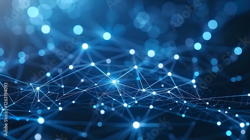 Glowing blue network connections with bokeh light effects on dark background, representing digital technology, artificial intelligence and data transfer.