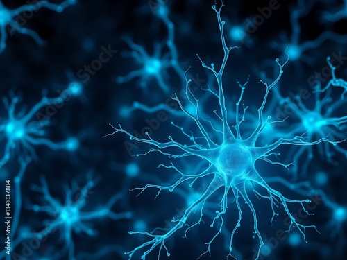Glowing blue neurons intricately branching a mesmerizing microscopic view. AI Generated