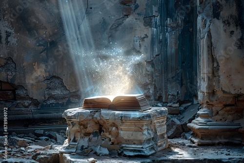 Glowing Book of Ancient Knowledge Emanating from Weathered Marble Plinth in Crumbling Ruins